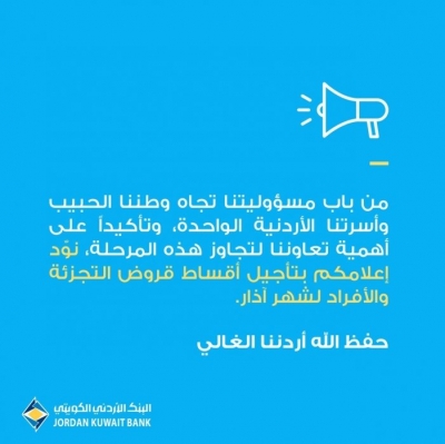 البنك الاردني الكويتي يعلن عن تأجيل استحقاق اقساط قروض التجزئة والأفراد لشهر آذار الحالي