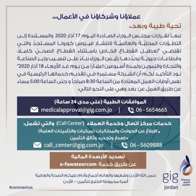 gig jordan تعلن استمرارها بتقديم خدماتها الرئيسية
