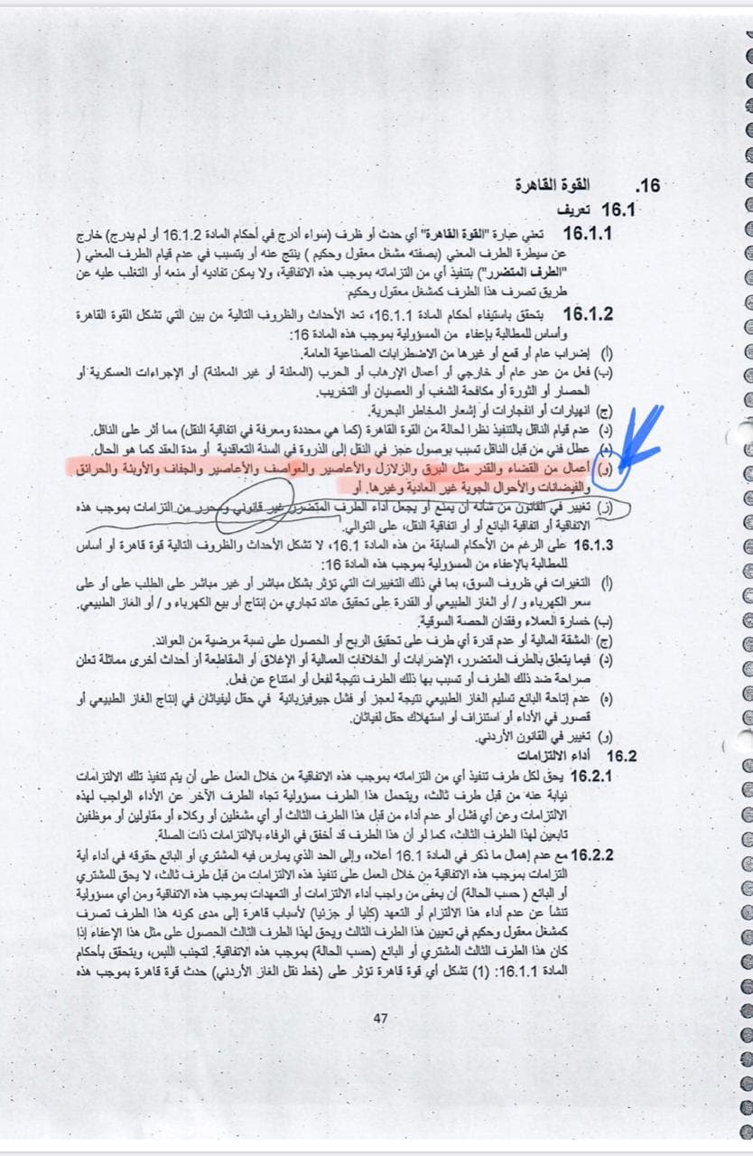 وكالة الناس – كتب الخبير في شؤون النفط والطاقة، عامر الشوبكي – في اتفاقية الغاز بين الاردن و الكيان الصهيوني ورد في الفصل رقم 16 تعريف الوباء كشرط لتوفر القوة القاهرة والذي يجيز وقف الاتفاقية دون تحمل اي التزام.