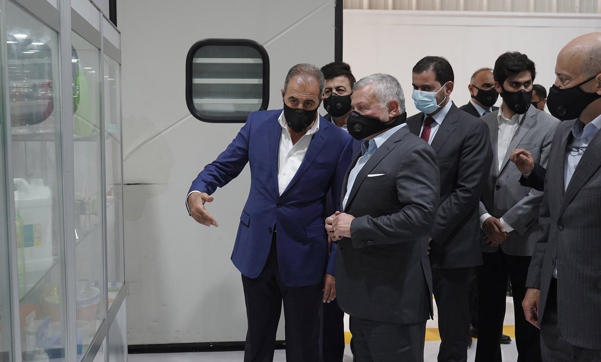 وأشاد جلالته، خلال زيارته مجموعة العملاق الصناعية في المفرق اليوم الثلاثاء، بمستوى وحجم صناعة المعقمات في الأردن، وأهمية تطويرها في ظل الإقبال عليها، جراء وباء كورونا، وجال جلالة الملك في المجموعة، التي تضم مصنعا، يُعد الأحدث في الشرق الأوسط، لإنتاج أربع مواد أولية بطاقة إنتاجية تقدر بـ 22 ألف طن سنوياً، تستخدم في صناعة المعقمات ومستحضرات التجميل، وبحجم استثمار يبلغ 14 مليون دينار، ويتوقع أن يحقق الاكتفاء الذاتي بهذه الصناعة.