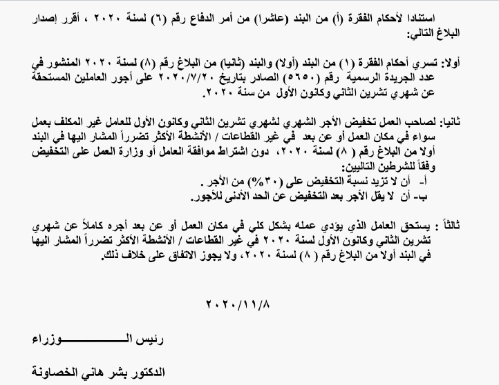 وكالة الناس –  اصدر رئيس الوزراء بشر الخصاونة، بلاغ رقم 13 بالاستناد لاحكام أمر الدفاع رقم 6 لسنة 2020، الجريدة الرسمية.