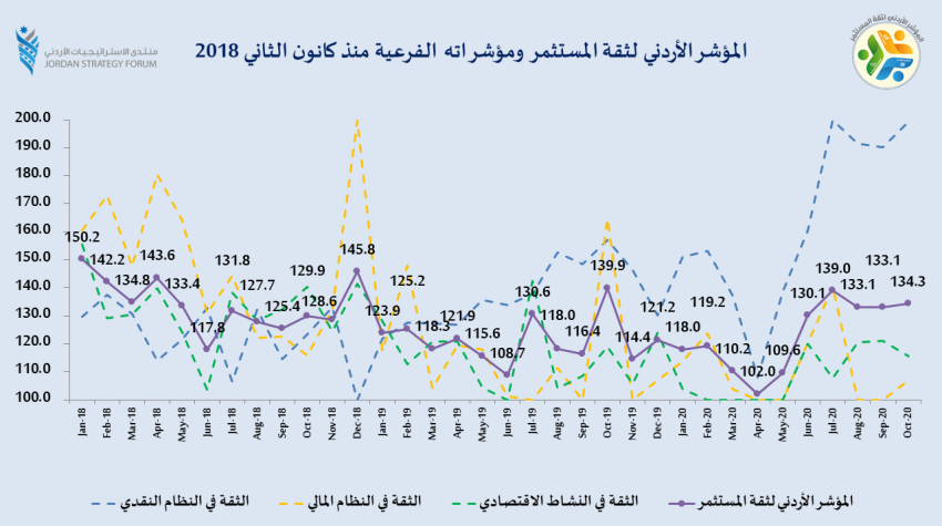 وكالة الناس – شهد المؤشر الأردني لثقة المستثمر الصادر عن منتدى الاستراتيجيات الأردني، ارتفاعا ليصل إلى 134.3 نقطة في شهر تشرين الأول/ أكتوبر 2020، بعد أن كانت قيمته 133.1 في شهر أيلول/ سبتمبر 2020.