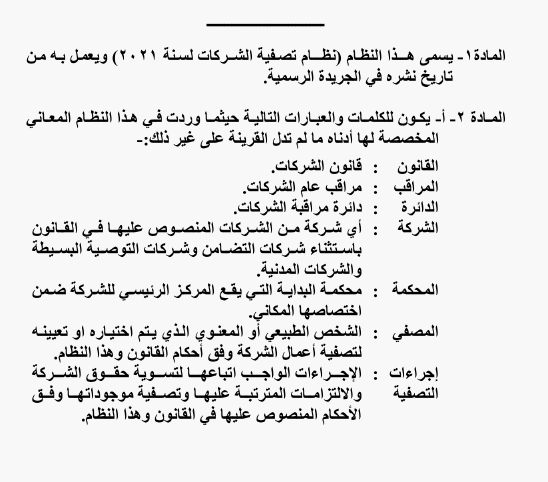 الحكومة تقر نظاماً جديداً لتصفية الشركات On يناير 17, 2021 Share وكالة الناس – صدر في الجريدة الرسمية اليوم الأحد، نظاما جديدا لتصفية الشركات. وتاليا التفاصيل: