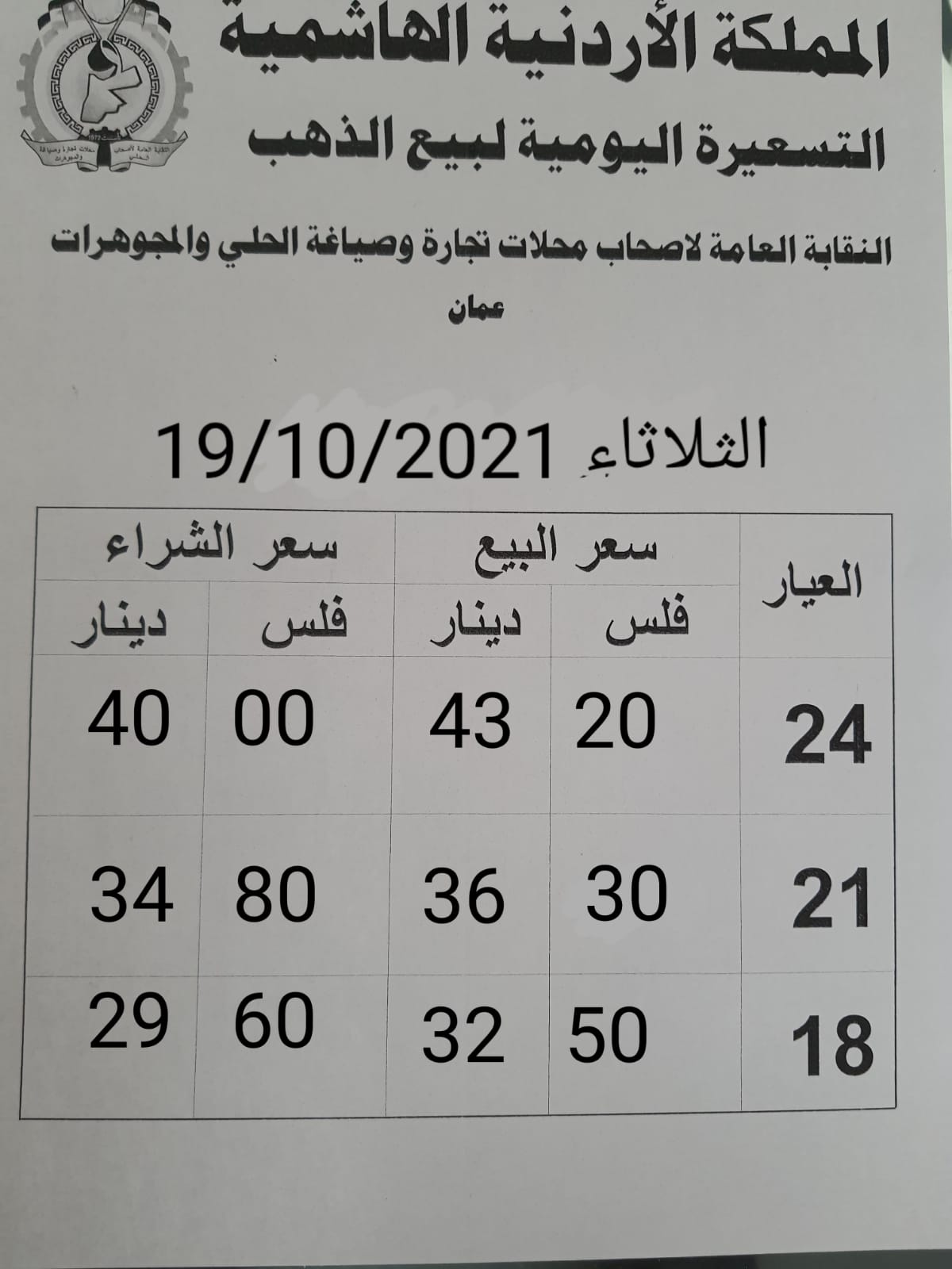 وبحسب التسعيرة اليومية لأصحاب محلات تجارة وصياغة الحلي والمجوهرات، بلغ سعر بيع الغرام من الذهب عياري 24 و18 لغايات الشراء من محلات الصاغة عند 43.20 و32.50 دينارا على التوالي.