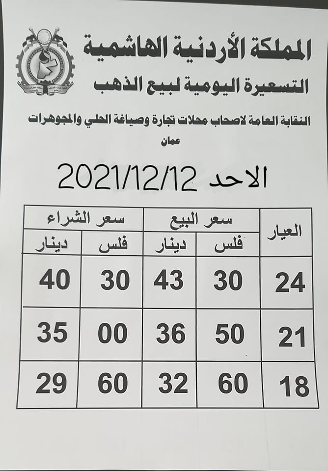 وكالة الناس – إستقرت أسعار بيع الذهب في السوق المحلي الأردني اليوم الأحد، بحسب ما أعلنت النقابة العامة لأصحاب محال تجارة وصياغة الحلي والمجوهرات.