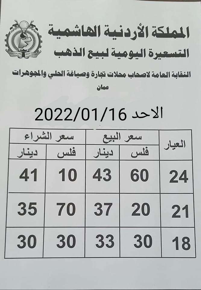 وكما استقر سعر الغرام من عيار 24 قيراط عند 43 دينارا و 60 قرشا، كما بلغ سعر عيار 18 عند 33 دينارا و 30 قرشا لغايات الشراء للمواطنين.