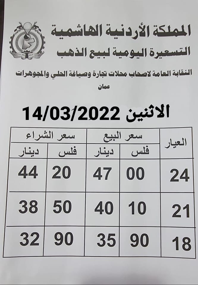 وبلغ سعر بيع غرام الذهب عيار 21 الأكثر طلبا في السوق المحلية 40.10 دينارا لغايات شراء المواطنين من محلات الصاغة، مقابل 44.20 دينارا لجهة البيع.