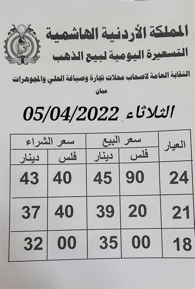 وبلغ سعر بيع غرام الذهب عيار 24 وفق التسعيرة الصادرة عن النقابة العامة لاصحاب محلات الحلي والمجوهرات 39.20 دينارا لجهة البيع للمواطنين، و37.40 دينارا لجهة الشراء منهم.