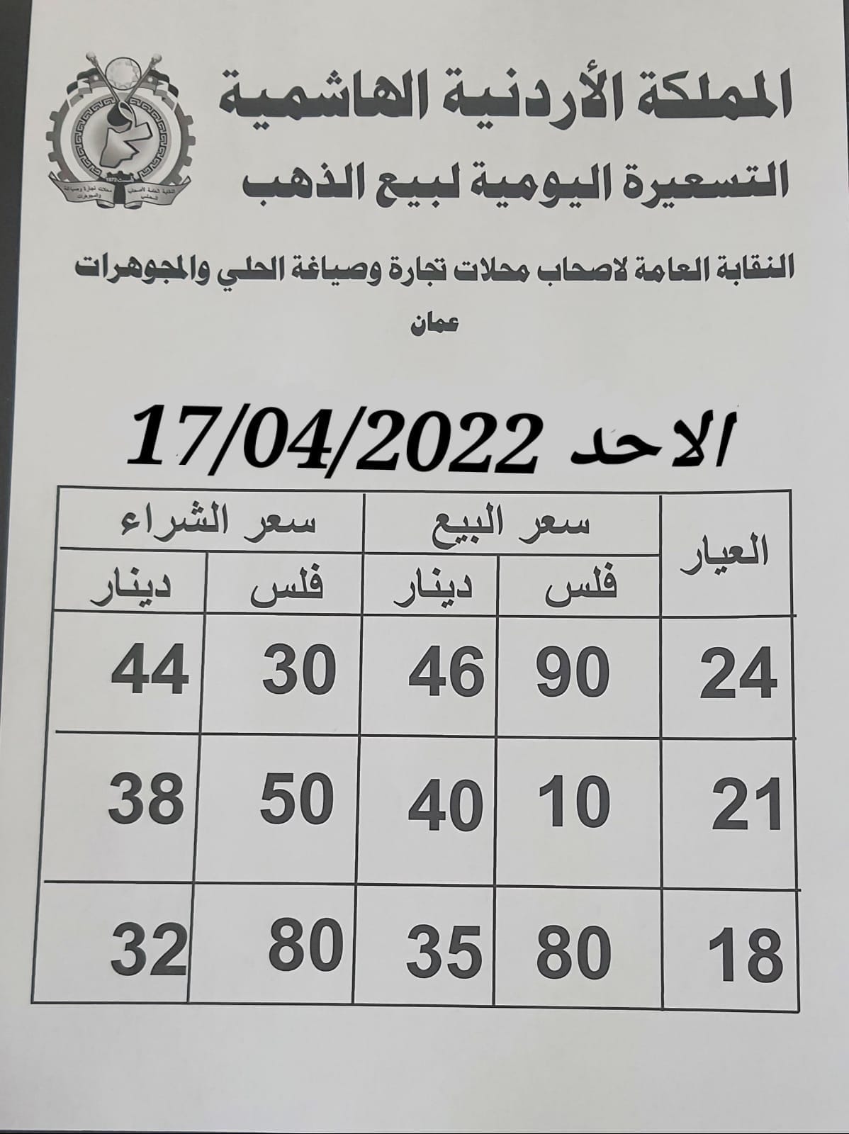 وكما بلغ سعر غرام الذهب عيار 24 وعيار 18 لغايات الشراء 46.90 دينارا و 35.80 دينارا على التوالي.