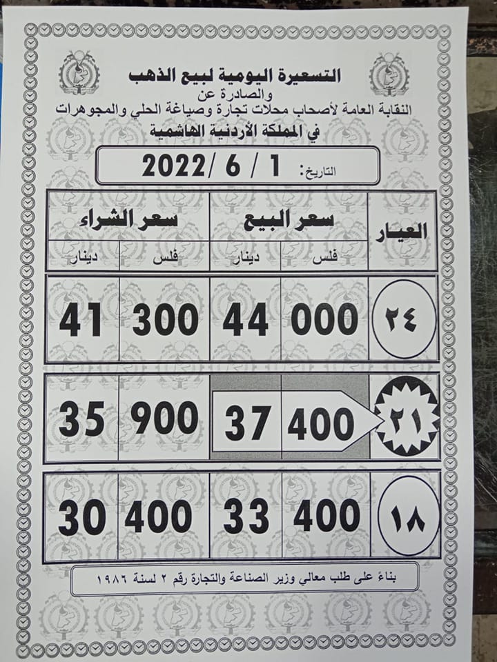 وبلغ سعر شراء غرام الذهب عيار 21 الأكثر رغبة من الأردنيين بالسوق المحلية 37.40 دينارا و35.90 دينارا لغاية البيع.