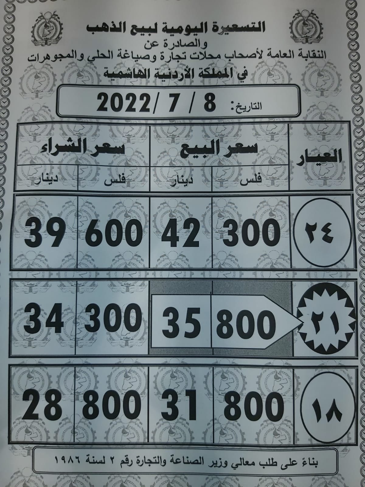 وبلغ سعر الغرام الواحد من الذهب (عيار 21) الأكثر طلبا لدى الأردنيين، 35.80 دينارا لجهة البيع و 34.30 دينارا لجهة الشراء من المواطنين.