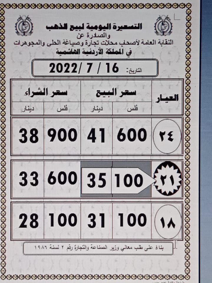 وبلغ سعر غرام الذهب عيار 21 الاكثر طلبا لدى الاردنيين في السوق المحلي 35.10 دينارا لجهة الشراء و 33.60 لجهة البيع.