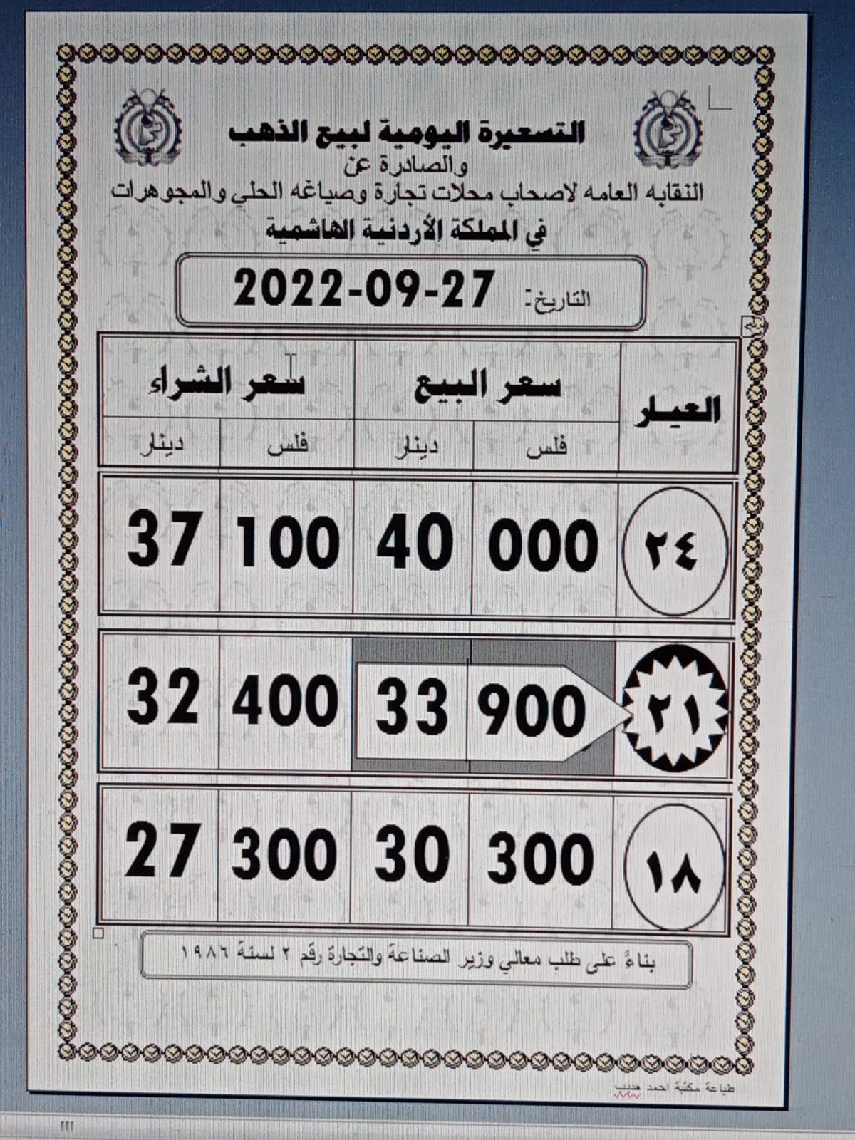 فيما بلغ سعر الذهب عياري (24) و (18) 40.00 و 30.30 دينارا على التوالي لجهة شراء المواطنين من التجار .