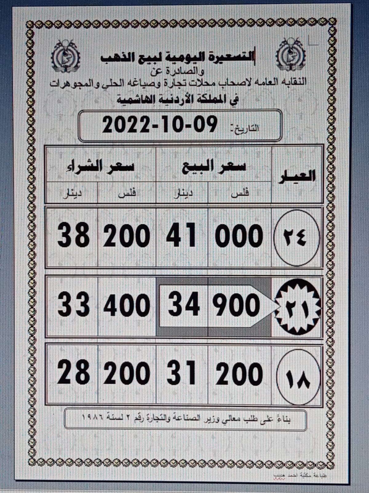 وبلغ سعر شراء الغرام الواحد عيار 21 قيراط الأكثر طلبا بين الأردنيين 34.9 دينارا و 33.4 دينار لغاية البيع للصاغة.