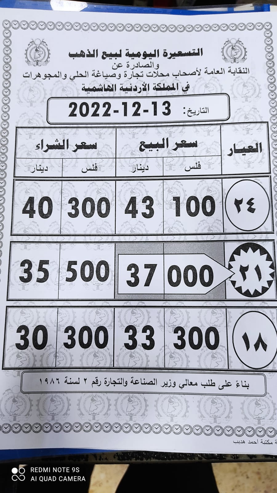 وبلغ سعر غرام الذهب عيار 21 عند 37 دينارا، لجهة الشراء من المحلات مقابل 35،50 دينارا لجهة البيع.