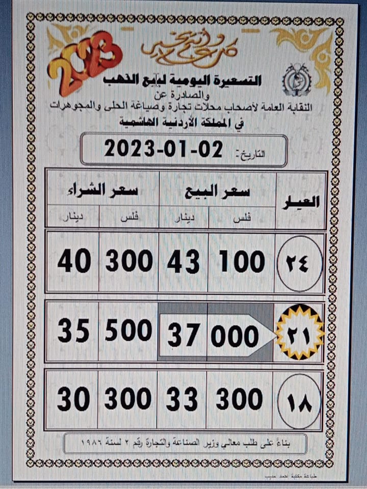 وبلغ سعر غرام الذهب عيار 21 عند 37.00 دينارا، لجهة الشراء من المحلات مقابل 35.30 دينارا لجهة البيع.