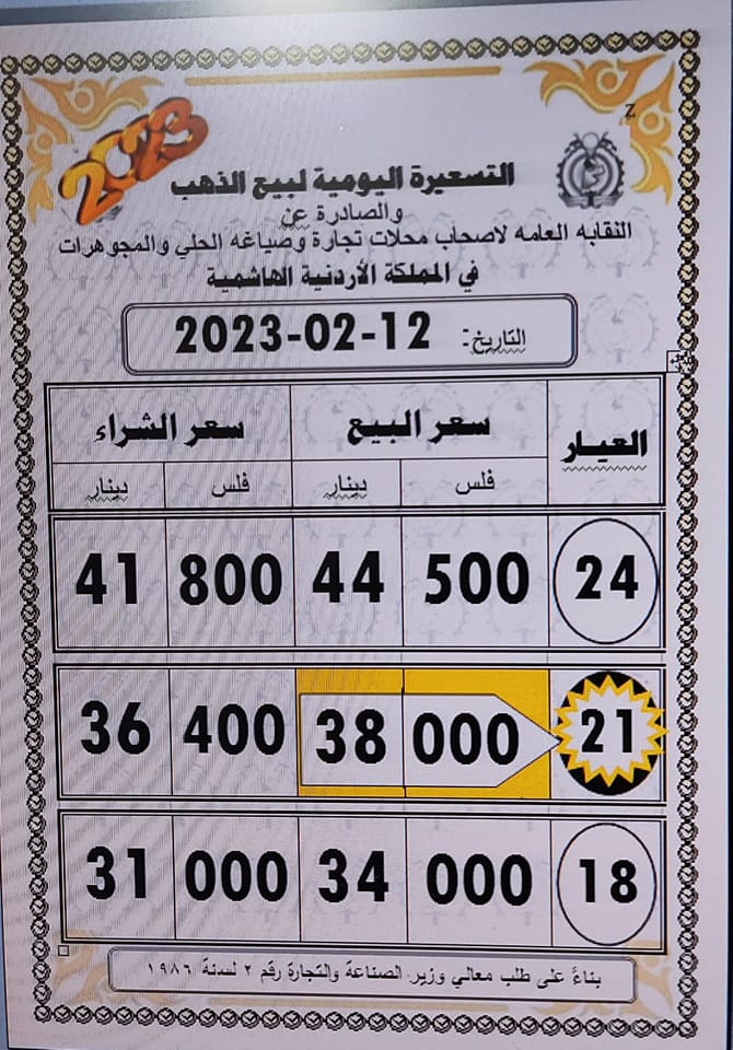 وبلغ سعر الذهب عيار 21 الأكثر طلبا من قبل الأردنيين 38.00 دينارا لجهة الشراء من المحلات و 36.40 دينارا لجهة البيع.