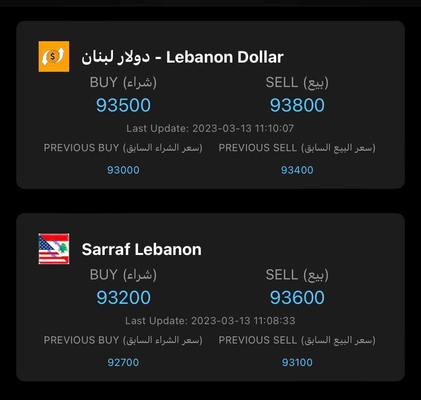 وأظهرت التطبيقات التي تتابع سعر صرف الدولار في السوق السوداء، أن سعر صرف الدولار سجل 93800 ليرة للبيع و93500 ليرة للشراء.