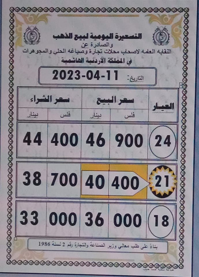 ووفق التسعيرة الصباحية بلغ سعر غرام الذهب من عيار 21 وهو الأكثر رغبة لدى الأردنيين 40.40 دينارا للغرام الواحد، لجهة الشراء من المحلات، مقابل 38.70 لجهة البيع.