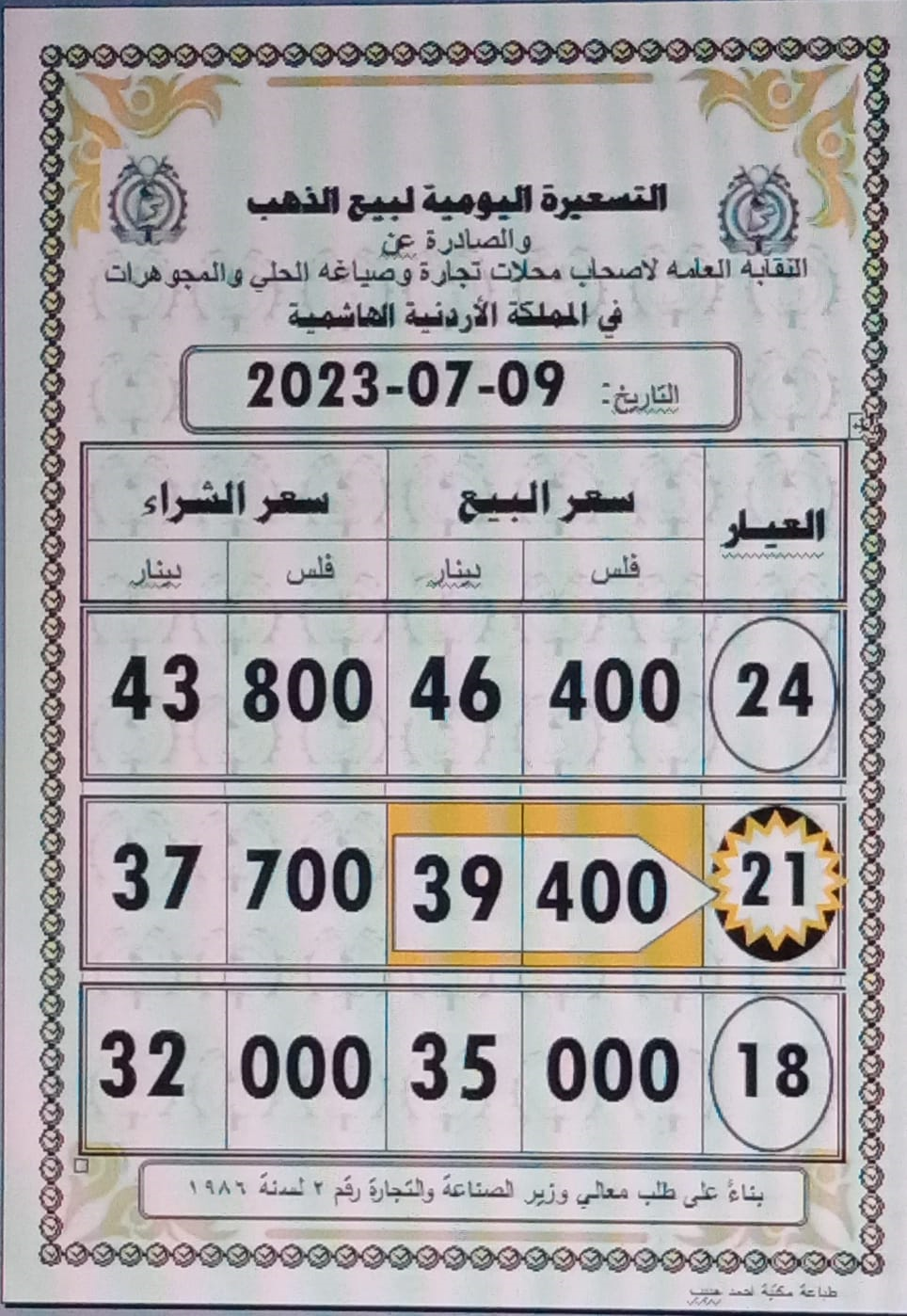 وبلغ سعر غرام الذهب عيار 21 عند 39،40 دينارا، لجهة الشراء من المحلات مقابل 37،70 دينارا لجهة البيع.