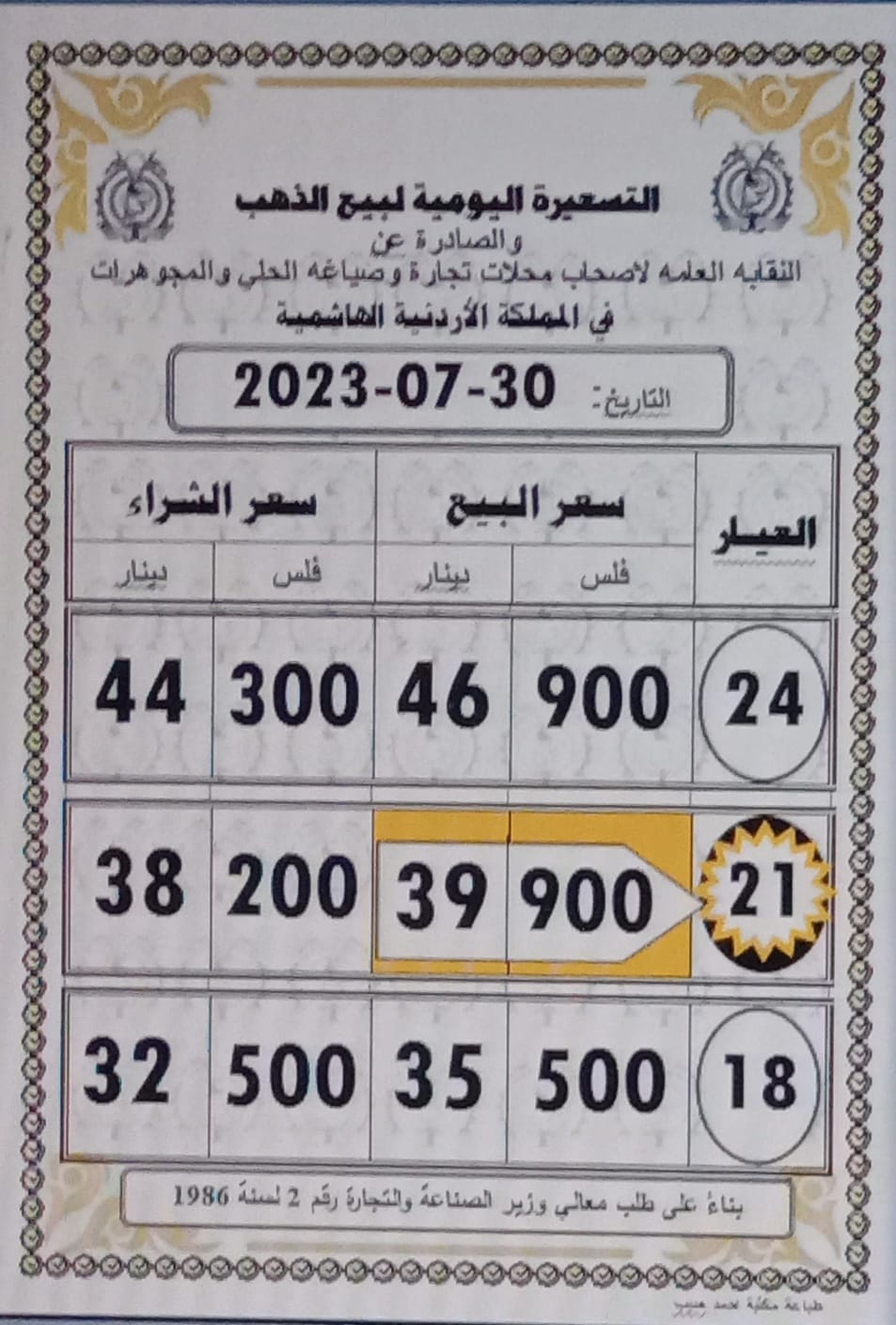 وبلغ سعر غرام الذهب (عيار 21) الأكثر طلبا لدى الأردنيين 39،90 دينارا لجهة البيع، و 38.20 دينارا لجهة الشراء من المواطنين.