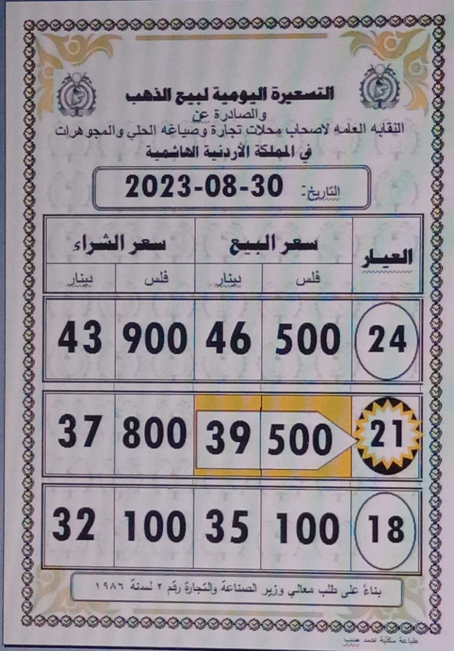 وبلغ سعر جرام الذهب من عيار 21 الأكثر طلبا لدى الأردنيين، 39.50 دينارا لجهة الشراء من المحال، فيما بلغ 37.80 دينارا لجهة البيع.