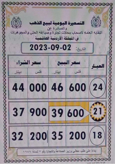 وبلغ سعر غرام الذهب من عيار 21، الأكثر طلبا لدى الأردنيين، 39.6 دينارا لجهة الشراء من المحال، و37.9 دينارا لجهة البيع.
