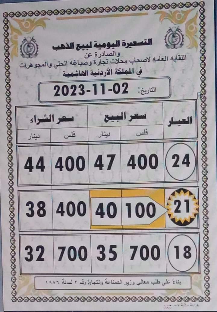 وكما بلغ سعر بيع الجرام الواحد من الذهب عياري 24 و18 لغايات الشراء من محلات الصاغة، 47.40 و 35.70 دينارا على التوالي.