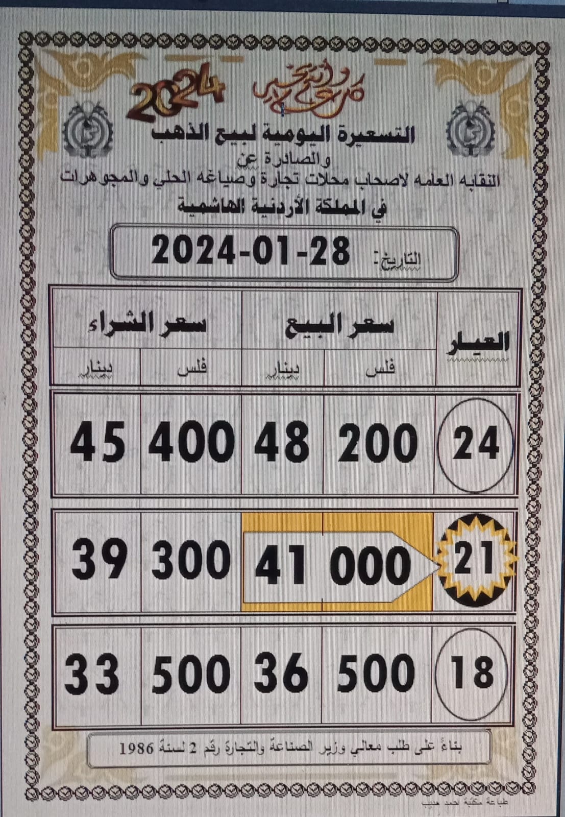 وبلغ سعر بيع الذهب عيار 21 الأكثر رغبة بين المواطنين 41 دينارا، مقابل 39.30 دينارا للشراء من المواطنين.