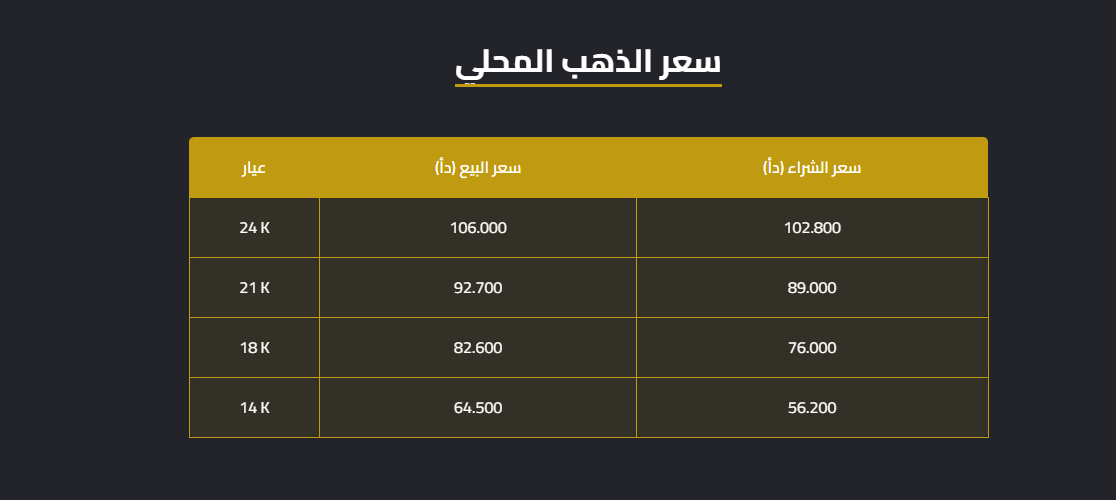 وبلغ سعر بيع غرام الذهب عيار 21، في السوق المحلية، 92.7 دينارا لغايات البيع من محالّ الصاغة، مقابل 89.0 دينارا لجهة الشراء.