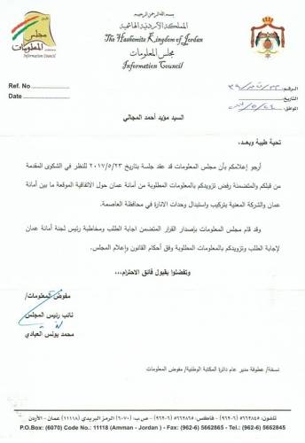 وكالة الناس – في سابقة هي الأولى من نوعها قرر مجلس المعلومات إجابة طلب المعلومات الذي تقدم به مؤيد المجالي الباحث القانوني في مركز إحقاق للدراسات القانونية لأمين عمان لتزويده بصورة من الاتفاقية المثيرة للجدل التي وقعت بين أمانة عمان الكبرى من جهة وبين مجموعة “كاي بي دبليو الأردن”، إحدى شركات الأمير خالد بن الوليد بن طلال لتنفيذ مشروع إنارة مدينة عمان،