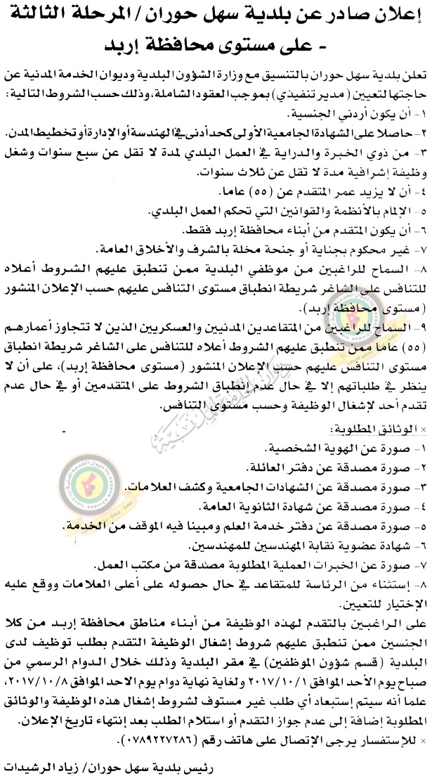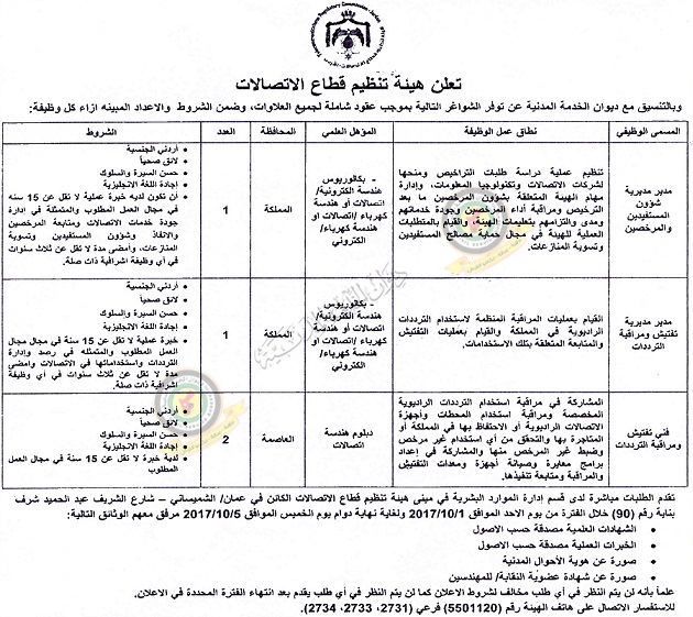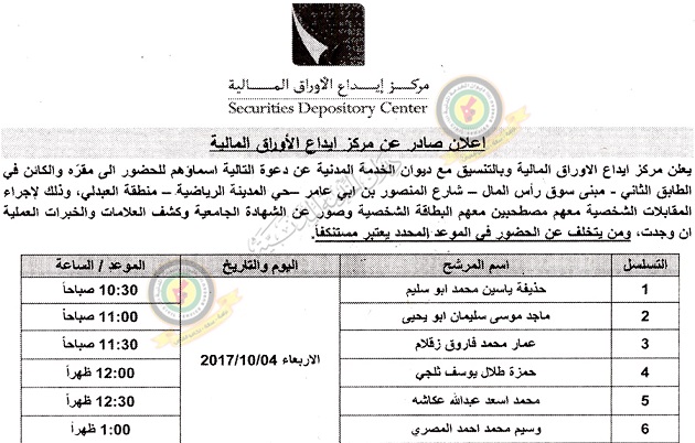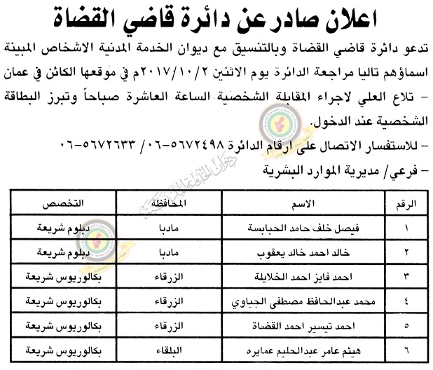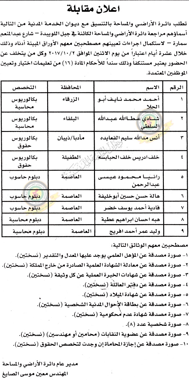 مدعوون للتعيين ووظائف شاغرة - أسماء مدعوون للتعيين ووظائف شاغرة ..أسماء On أكتوبر 1, 2017 Share وكالة الناس – دعا ديوان الخدمة المدنية بالتعاون مع مختلف الوزارات والمؤسسات الحكومية التالية اسماؤهم لاجراء المقابلات الشخصية وملئ الشواغر لغايات التعيين وبحسب ديوان الخدمة، فإن كل من يتخلف عن الحضور يعتبر مستنكفا عن التعيين، داعيا اياهم الى احضار الاوراق الشخصية اللازمة. عدد المشاه