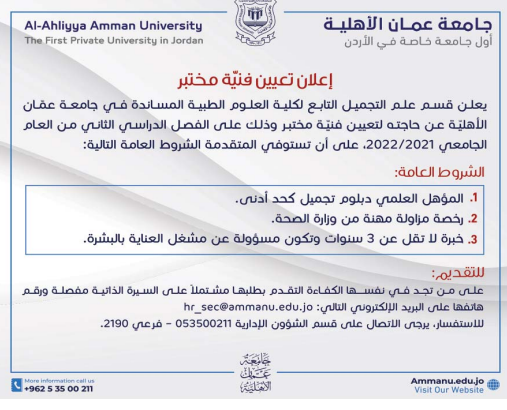 مطلوب تعيين فنية مختبر للعمل لدى جامعة عمان الاهلية