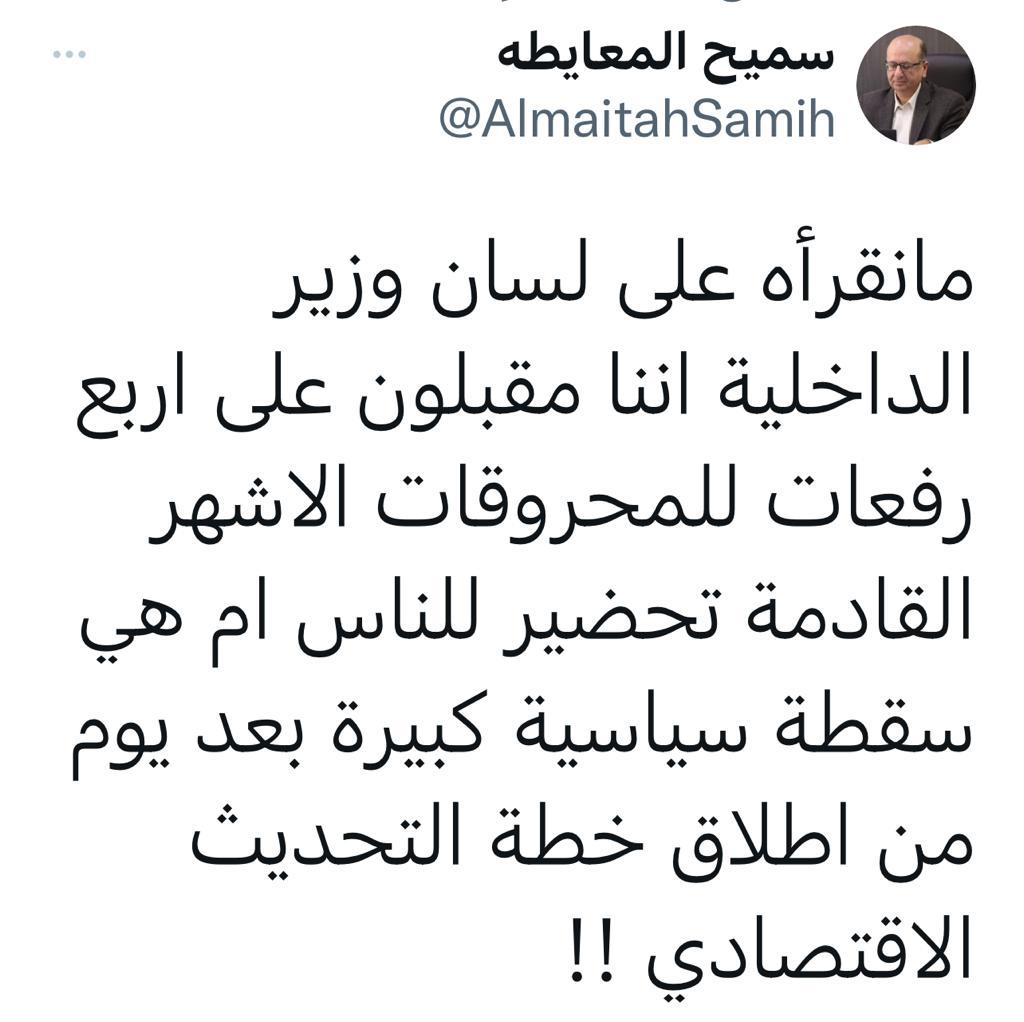 وتساءل المعايطة في منشور عبر فيسبوط: “ما نقرأه على لسان وزير الداخلية اننا مقبلون على اربع رفعات للمحروقات الاشهر القادمة، تحضير للناس أم هي سقطة سياسية كبيرة بعد يوم من اطلاق خطة التحديث الاقتصادي!!”.