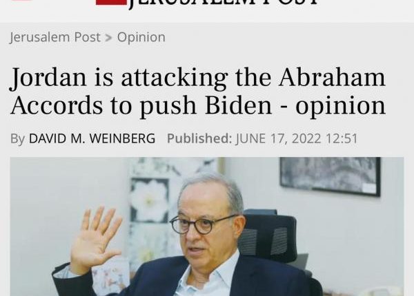 وكال الناس – قال ديفيد وينبيرج نائب رئيس معهد القدس للدراسات الاستراتيجية والأمنية، إن مروان المعشر وزير الخارجية ونائب رئيس الوزراء الأسبق والمقرب من النظام قام بمهاجمة اتفاقيات ابراهام، حيث وصفها بأنها “وصفة للعنف وليست للسلام”، ودعا الولايات المتحدة الأمريكية للتوقف عن إعطاء حوافز للحكومات العربية من أجل الانضمام للاتفاقيات طالما تستمر اسرائيل في الاستيلاء على الأراضي الفلسطينية.