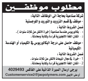 وظيفة شاغرة لدى شركة صناعية