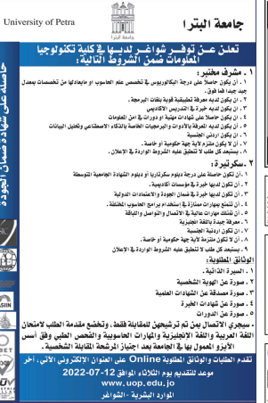 وظائف شاغرة لدى جامعة البترا