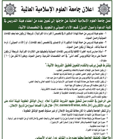 جامعة العلوم الاسلامية العالمية بحاجة لتعيين اعضاء هيئة تدريسية