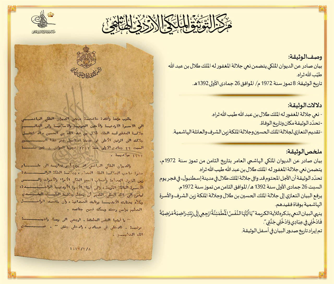 التوثيق الملكي يعرض وثيقة بذكرى وفاة الملك طلال