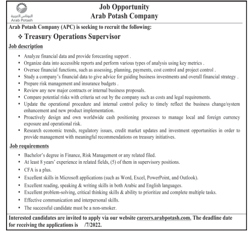 وظيفة شاغرة لدى شركة البوتاس العربية