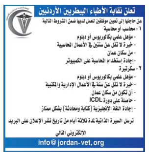 وظائف شاغرة لدى نقابة الاطباء البيطريين الاردنيين
