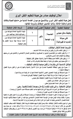 وظائف شاغرة لدى هيئة تنظيم النقل البري