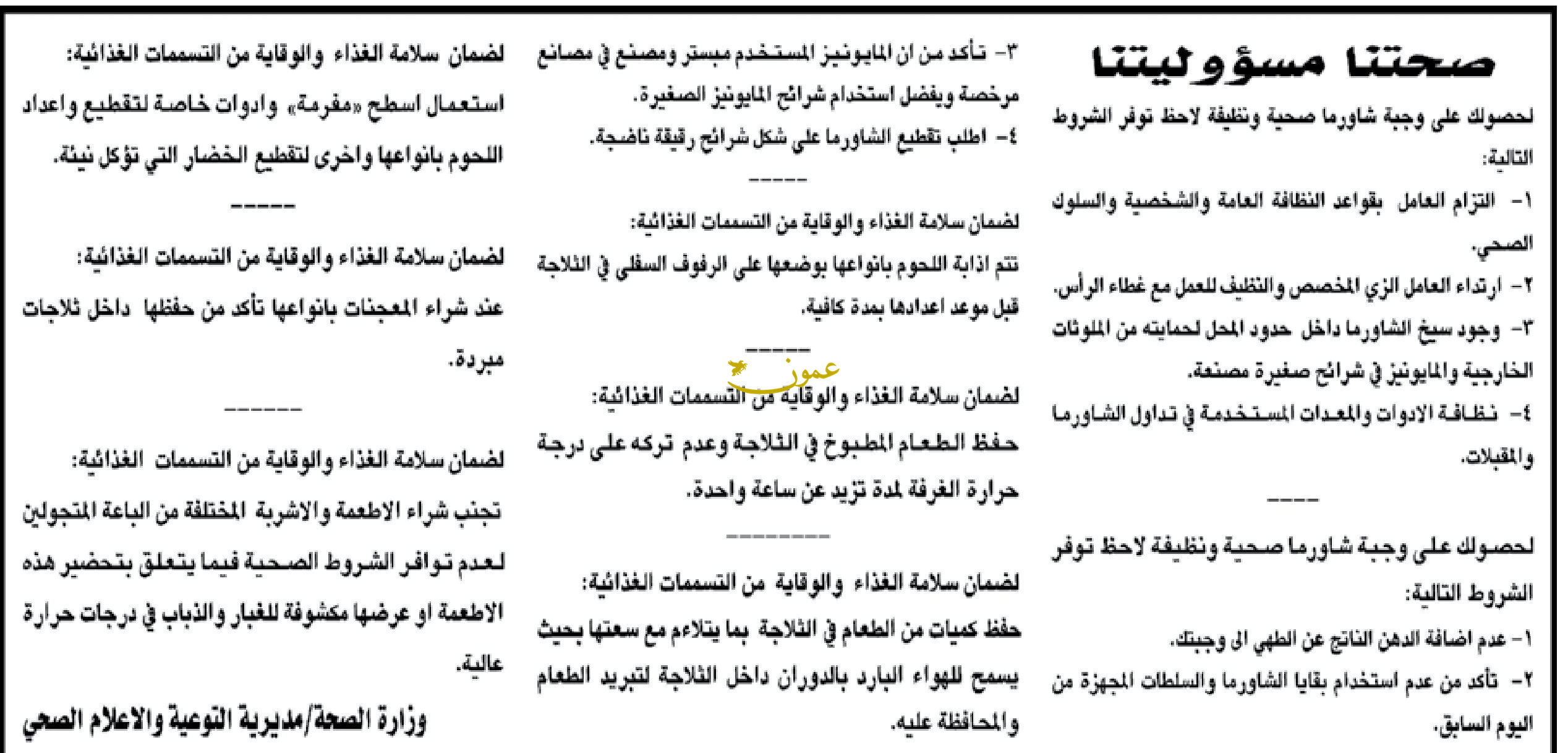 وقالت المديرية، في الإعلان المنشور عبر الصحف اليومية، “لحصولك على وجبة شاورما صحية ونظيفة لاحظ الشروط التالية: التزام العامل بقواعد النظافة العامة والشخصية والسلوك الصحي، وارتداء العامل الزي المخصص والتنظيف للعمل مع غطاء الرأس، ووجود سيخ الشاورما داخل حدود المحل لحمايته من الملوثات الخارجية والمايونيز في شرائح صغيرة مصنعة، ونظافة الأدوات والمعدات المستخدمة في تداول الشاورما”.