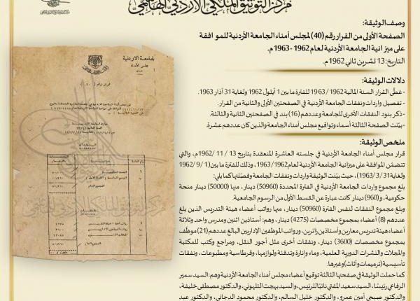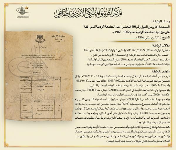 وكالة الناس – نشر مركز التوثيق الملكي الأردني الهاشمي، اليوم الجمعة، وثيقة بمناسبة الذكرى الستين على تأسيس الجامعة الأردنية، تحتوي على قرار مجلس أمناء الجامعة الأردنية في جلسته العاشرة المنعقدة في 13 من شهر تشرين الثاني من عام 1962، والتي تتضمّن الموافقة على ميزانية الجامعة الأردنية للفترة ما بين 1 من أيلول عام 1962ولغاية31 من آذار من عام 1963.