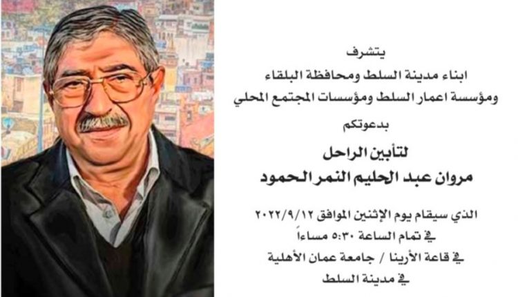 وكالة الناس – وجه ابناء مدينة السلط ومحافظة البلقاء ومؤسسة اعمار السلط ومؤسسات المجتمع المحلي دعوة عامة لتأبين الراحل مروان عبد الحليم النمر الحمود، وذلك يوم الاثنين المقبل 12/09/2022 في تمام الساعة 5:30 مساءا في قاعة الارينا / جامعة عمان الاهلية في مدينة السلط.