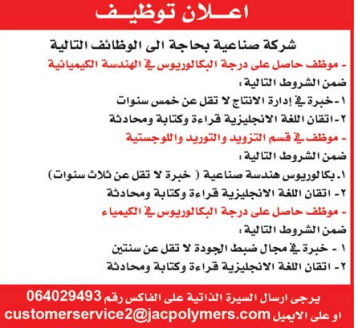 وظائف شاغرة لدى شركة صناعية