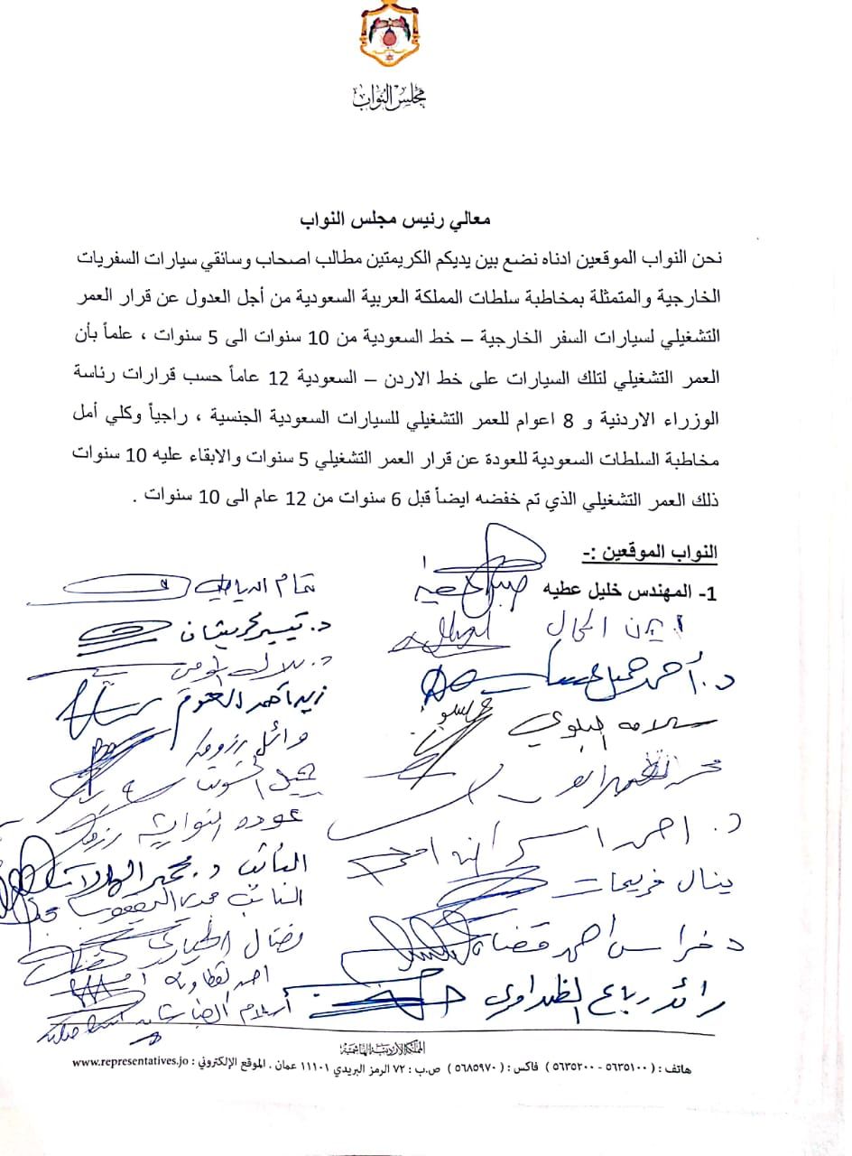 وأشارت المذكرة إلى أن العمر التشغيلي لتلك السيارات على خط الأردن – السعودية 12 عاماً حسب قرارات رئاسة الوزراء الاردنية و 8 أعوام للعمر التشغيلي للسيارات السعودية الجنسية، مبينة أن قرار العمر التشغيلي تم خفضه ايضا قبل 6 سنوات من 12 سنة إلى 10 سنوات.