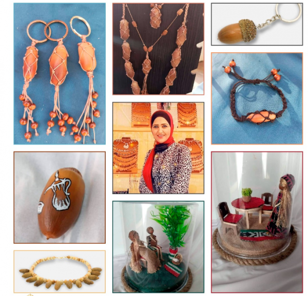 بدورها، تقف دينا ياسين، وهي أيضا مدربة في مجال الحرف اليدوية، وتصنيع الاكسسوارات من نواة التمر والزيتون، إلى جنب صديقتها أبو هزيم في المعرض وتتقاسمان الربح معا.