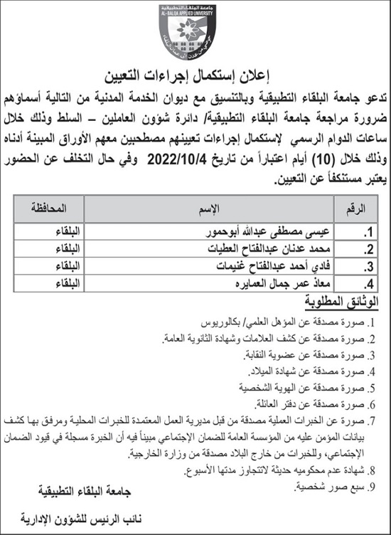 وكالة الناس – تدعو جامعة البلقاء التطبيقية وبالتنسيق مع ديوان الخدمة المدنية التالية اسماؤهم لمراجعة دائرة شؤوون العاملين في جامعة البلقاء / السلط
