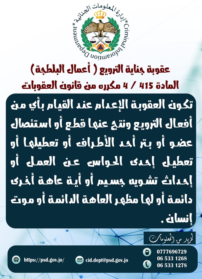 وكالة الناس – قالت إدارة المعلومات الجنائية بمديرية الامن العام ان العقوبة الخاصة بجرائم الترويع (أعمال البلطجة) تصل الى حد الاعدام.